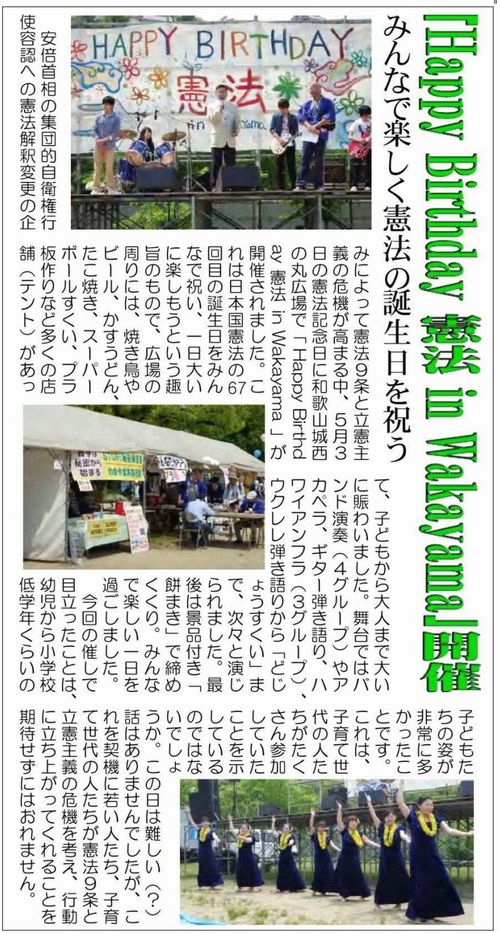 「Happy Birthday 憲法」は、14年5月以来毎年「憲法記念日」に開催されてきました。残念ながら20年から新型コロナウイルス感染症の拡大のため、中止となりました。是非早い再開を期待し、14年の会紙246号の記事をご紹介します。