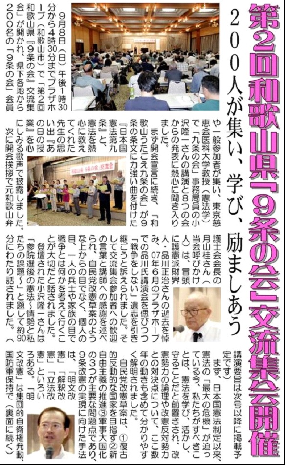 それ以来、このような集会は開かれておりませんでしたが、この度「憲法9条を守る交流集会・和歌山」の開催が計画されています。是非とも大成功を収めることを期待し、2013年9月14日付の会紙227号の記事をご紹介します。