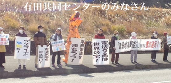 有田共同センターの「3日の行動」は、2月3日ついに100回目。回数を重ねましたが、途中からの雨で早く切り上げたことはありましたが、「雨で中止」は一回もなかったのです。今回も無事に行動できました。恐竜も参加して29人。みんな元気です。