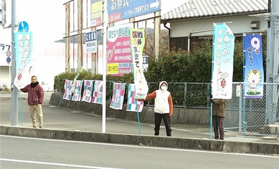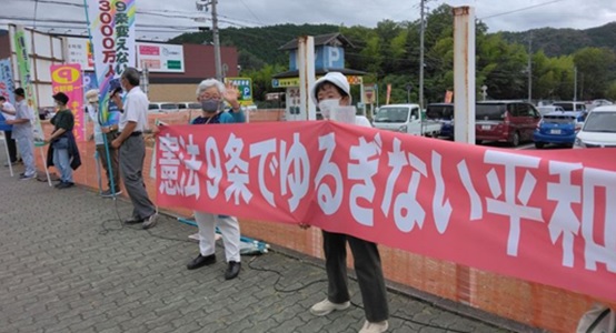 2月3日、節分の日に、みなべ「九条の会」では143回目のピースアピールを行いました。風は強くなく、日が射すと暖かさを感じる絶好の天候でした。この時期みなべは、観梅のシーズンです。今年は1月から暖かい日が多かったため、すでに梅の花は多く咲いています。アピールを実施した「東吉田交差点」は梅林に近く、普段より多くの他府県ナンバーの車が通り、観光バスも数台通っていました。そのような中、参加した会員で代わる代わる「九条変えるな」「裏金問題徹底追求」「武器輸出反対」をアピールしました。