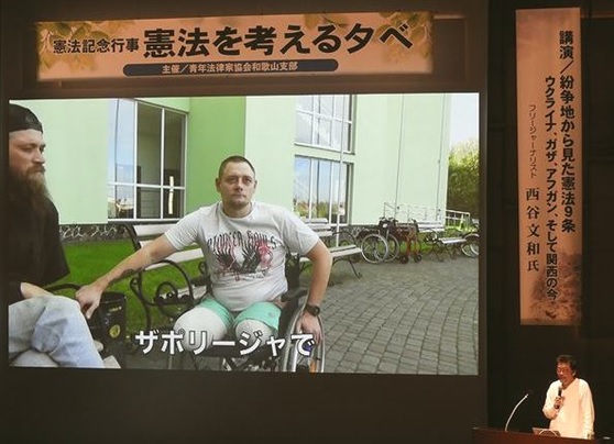 4月26日、和歌山城ホールで「青法協憲法記念行事『憲法を考える夕べ』」が開催され、フリージャーナリスト西谷文和氏が「紛争地から見た憲法9条 ウクライナ、ガザ、アフガン そして関西の今」と題して講演をされました。