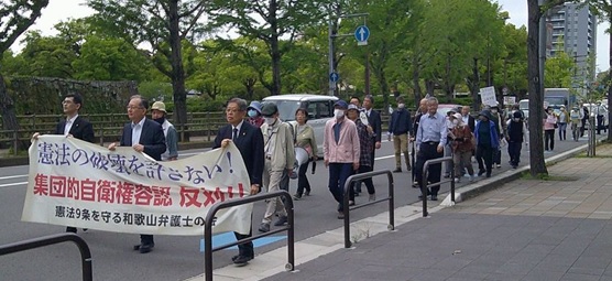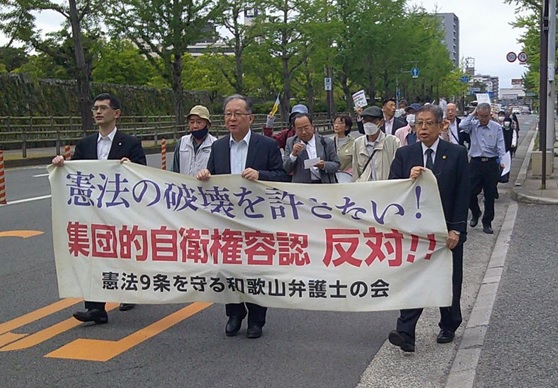 小雨模様の傘マークが並んでいた4月24日、何とかデモの間は雨が降らず、曇天の下でしたが、無事118回「憲法の破壊を許さないランチタイムデモ」(呼びかけ:憲法9条を守る和歌山弁護士の会)が行われ、40人の市民が参加しました。