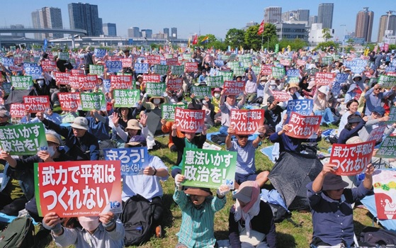 日本国憲法の施行から77年となった憲法記念日の3日、岸田政権が敵基地攻撃能力(反撃能力)の保有や自衛隊と在日米軍の連携強化を進め、憲法が掲げる平和主義が揺らぐ中、護憲派グループは東京都江東区の有明防災公園で大規模集会を開催。3万2000人(主催者発表)が参加し、「戦争をさせない決意を新たにしなければならない」と訴えた。