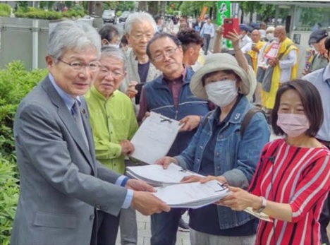 立憲民主党の逢坂誠二衆議院議員、日本共産党の赤嶺政賢衆議院議員、沖縄の風の高良鉄美参議院議員が挨拶。大軍拡・大増税に反対する署名、憲法改悪を許さない署名、計36万6473人分を国会議員に手交しました。