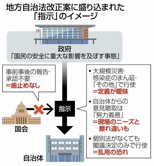地方自治法改正案とは非常時に国が自治体に必要な指示を出せるようにするものです。閣議決定を経れば指示できる仕組みで、恣意的な運用のおそれがあります。政府は大規模災害や感染症などの際に個別の法律で想定しない事態が起きた場合、国民の安全を確保するために必要だと説明しています。有事の際に港湾や空港などを使うには、特定公共施設利用法で自治体が国の要請に意見を申し出る規定があり、可能な限り慎重な手続きが課せられています。しかし、今回の改正案では、国は国会承認なしに自治体に網羅的に指示ができ、「国民の安全に重大な影響を及ぼす事態」の「おそれ」の段階で、自衛隊のための道路開放や攻撃に備えた自治体職員の動員協力にまで道が開けます。「想定していない」と言われても法律上可能になることは許してはなりません。