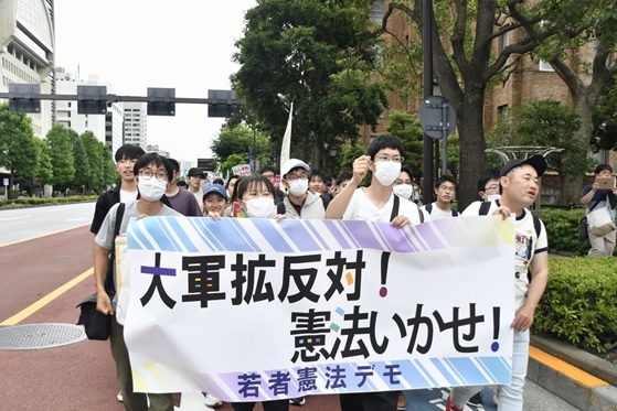 集会後、銀座で行われた「若者憲法デモ」には全国から集まった1200人の参加者(主催者発表)が、「軍事費ではなく教育・福祉を」などのプラカードを掲げながら、リズムにのせて「日本を戦争国家にするな」「憲法変えるな憲法生かせ」と声をあげました。沿道から手を振る人やスマホを向ける人など、大きな注目を集めました。