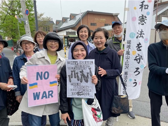嵯峨嵐山駅、遅い桜も散った4月中旬。世界中の観光客が駅舎から溢れ出てくる中、私たちはその日も定例の9条宣伝をしていました▼そこにトコトコと近づいてきたインドネシアからの留学生(上の写真)。「一緒に宣伝に加わってもいいですか?」とにっこり。「このプラカードは自作で、いつも持ち歩いていて奈良、大阪、京都でこうした行動があると参加しています」と▼「日本は広島、長崎、沖縄の上陸を経験しているのに何故アメリカの言いなりなの?軍事費にどうしてお金を沢山出すの?」彼女は日本語が堪能で真っ直ぐな質問を私たちに投げかけ、30分間宣伝に加わってくれました▼この日も多くの観光客が私たちの訴えを見て聞いて共感のポーズを示してくれます。子ども連れの母親は「この子も署名できますか?」と▼肌の色も国籍も違う私たち、言葉も通じない中での一期一会ですが、こうして『戦争はダメ!』と意思を伝え合い共感し、嵐山の地で笑顔を交わしていると思うと細胞が踊り出すような感動がありました。(A&K)(【京都】「嵯峨・広沢・嵐山9条の会ニュース」6月号より転載)