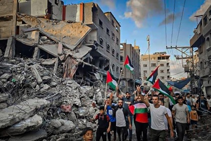 (ガザの惨状と抗議する人々)