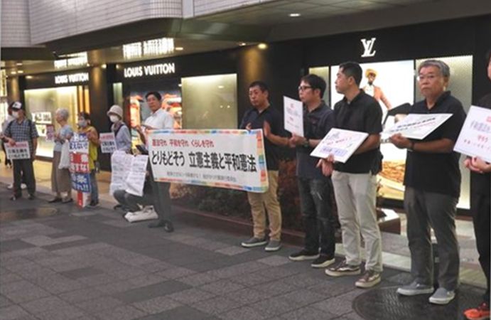 行動には約40名の市民が参加し、通行の人々に横断幕やステッカーでアピールするとともにマイクで訴えました。呼びかけ団体から県地評の武田議長が「9年前に閣議で集団的自衛権を容認し、安保法制が成立してから着々と日米同盟が深まり、自衛隊が米軍の指揮下に入る仕組みや、沖縄の基地強化が推進されている。これをマスコミは報じない。私たちが語っていこう。選挙で勝利して憲法違反の安保法制をなくそう」と発言。藤本まりこ県議が「日本国憲法の大切な点は、国民主権、基本的人権、平和主義だ。国家の暴走を止めるのが憲法だから、自民党がねらう緊急事態条項は許せない」などと訴えました。