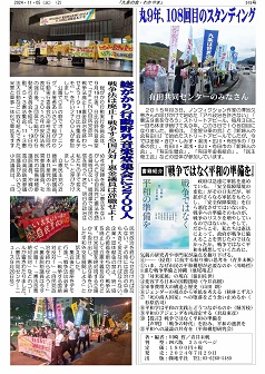 2015年月3日、ノンフィクション作家の澤地久枝さんの呼びかけで始めた「アベ政治を許さない」「憲法9条を守ろう」ストリートアピール。毎月3日に一回も休まず続けて丸9年、この3日で108回目になりました。最初は、『金屋9条の会』と『新婦人の会有田川』で始めたストリートアピールでしたが、今では金屋・きび・しみず・湯浅・広川・有田市の「9条の会」、有田川・湯浅・広川・有田市の「新婦人の会」、「有田生健会」、「有田年金者組合」、「民主商工会」などの団体が参加しています。