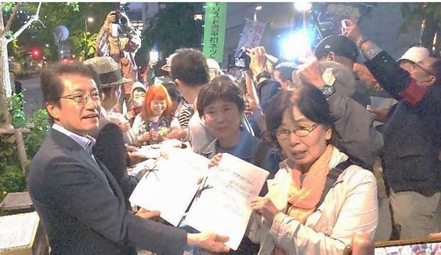 総がかり行動実行委員会は5月19日夜、「戦争できる国づくりを許さず、選択的夫婦別姓を実現しよう! TheEND自民党政治5・19国会議員会館前行動」を行い、700人が参加。大軍拡反対署名18万836人分、憲法改悪反対署名など17万1232人分を国会に提出しました。日本共産党の倉林明子参議院議員、立憲民主党の有田芳生衆議院議員、社会民主党の福島瑞穂参議院議員、沖縄の風の高良鉄美参議院議員があいさつ。韓国からの連帯メッセージが紹介されました。