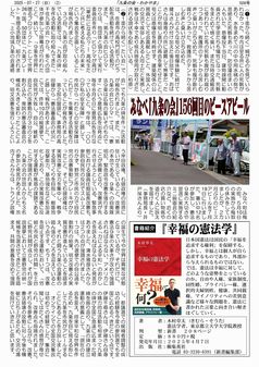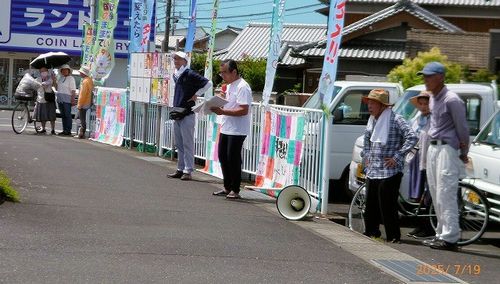みなべ町は梅の町。5月10日の実施から梅取り休みをしていましたが、2カ月ぶりのピースアピールを7月19日に行いました。暑い中12名が参加し、憲法9条の大切さや翌週に実施するミニ映画会の紹介など、近くの店の買い物客や道行く人に訴えを届けました。(事務局長・井戸保さんより)