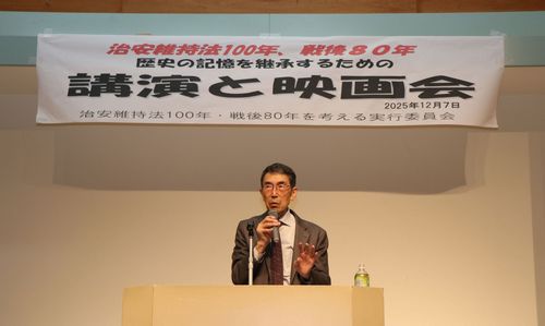 12月7日、「治安維持法100年・戦後80年 歴史の記憶を継承するための講演会」が開催され、大阪市立大学名誉教授・広川禎秀先生が「世紀の悪法・治安維持法と大阪商大事件」と題して講演をされました。