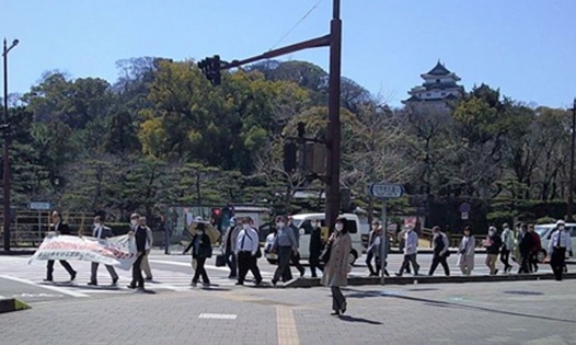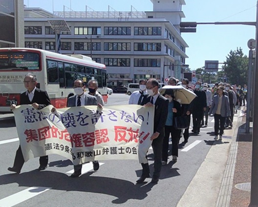 すっかり春の陽気となった3月15日、回を重ねて105回目の「憲法の破壊を許さないランチタイムデモ」(呼びかけ:憲法9条を守る和歌山弁護士の会)が実施され、60人の市民が参加しました。