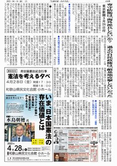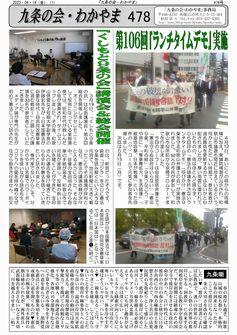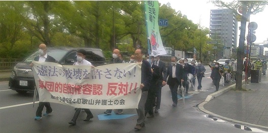 4月12日、あいにくの朝からの雨模様に加え、衆議院補選が公示され、和歌山市議選も間近に控えているという、何かと慌ただしい時期で、参加者数が過去最低を更新するのではないかと心配されましたが、厚い雨雲に覆われていたものの、雨はほとんど降らず、106回目の「憲法の破壊を許さないランチタイムデモ」(呼びかけ:憲法9条を守る和歌山弁護士の会)が実施されました。50人の市民が参加して、和歌山市役所前から京橋プロムナードまでを行進しました。