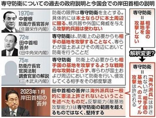 共産党の志位和夫委員長は今年1月の国会審議で「専守防衛の考え方は敵基地攻撃と両立しない」と矛盾を追及した。すると岸田文雄首相は田中氏の答弁について「武力行使の目的で武装した部隊を他国へ派遣する『海外派兵』は一般的に憲法上許されないことを述べたものだ」と説明。自衛隊を海外派兵する場合は「相手の基地を攻撃すること」に該当するが、相手の攻撃を防ぐために長射程ミサイルを用いるのは「専守防衛の範囲内」と主張した。