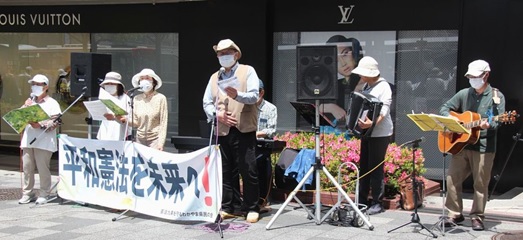 憲法記念日の5月3日、JR和歌山駅前で、「憲法記念日宣伝行動」が行われ、100人の市民が参加しました。平和委員会・伊藤氏、県地評・琴浦氏、戦争をさせない和歌山委員会・裏野氏、弁護士9条の会・豊田弁護士、県民の会・坂本氏、立憲民主党・山本市議、共産党・奥村県議、改新クラブ・藤本県議らの方々が次々と、「平和を守り抜こう」と訴えました。また「うたごえオールスターズ」のメンバーが平和の歌を披露しました。