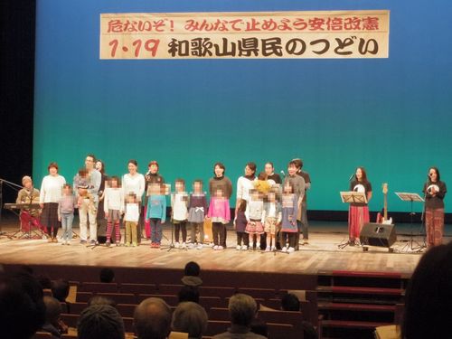 「つどい」からのメッセージ 私たちは、この「つどい」で、子どもたちや会場の皆さんと一緒に歌うために、「あの青い空のように」という曲を選びました。この曲の歌詞の1行目は、歌う者が自由に替え歌にして、自分たちの思いを歌い上げることが広く行われています。今日私たちが選んだことばは、「力を合わせよう」と「心をつなげよう」でした。 今、私たちが大事にしてきた日本国憲法が、何だかよく分からない理由で変えられようとしています。私たちが、戦争のない平和な暮らしを子どもたちに手渡すことができるのか、その瀬戸際にあるということも学びました。 私たち1人1人の力はとても小さいけれど、力を合わせれば、きっとできる。必ず子どもたちに私たちの宝物をひきつぐことができる。そのために「力を合わせよう」というメッセージを送ります。 今は幼い子どもたちも、やがては自分で周りを見わたし、自分で考え、自分の足で歩き出します。 私たちがみんなで力を合わせるためにも、お互いを理解し合い、心を通わせること、世代を超えて心をつなぐことがとても大切です。 私たちの思いを子どもたちにつなぎ、成長した子どもたちが、平和を願い、そのために自ら行動する人となるように、「心をつなげよう」というメッセージを送ります。 この「つどい」に集まった私たちは、老いも若きも、女性も男性も、互いに1人1人の人格を尊重し、平和を願い、公正を尊ぶという日本国憲法の理念を守り、より良い世界の実現のために全力を尽くすことを誓います。 2019年1月19日 「危ないぞ!みんなで止めよう安倍改憲 1・19和歌山県民のつどい」 参加者一同 ![]() ①入場する参加者 ![]() ②開演を待つ参加者 ![]() ③司会者開会宣言 ![]() ④開会挨拶 ![]() ⑤桂文福さん-1 ![]() ⑥桂文福さん-2 ![]() ⑦小林節氏講演-1 ![]() ⑧小林節氏講演-2 ![]() ⑨ピースバンド ![]() ⑩あの青い空のように ![]() ⑪メッセージ採択 ![]() ⑫閉会後のロビーで、小林節先生 |