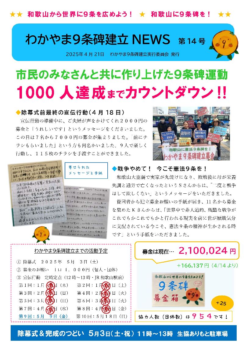 わかやま9条碑建立NEWS 第14号 (2025.04.21)