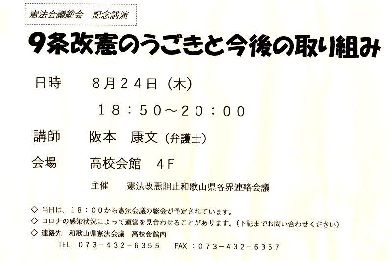 憲法会議総会 記念講演 9条改憲のうごきと今後の取り組み 日時 8月24日 (木) 18:50~20:00 講師 阪本 康文(弁護士) 会場 高校会館 4F 主催 憲法改悪阻止和歌山県各界連絡会議 ◇当日は、 18:00から憲法会議の総会が予定されています。 ◇コロナの感染状況によって運営を見合わせることがあります。 (下記までお問い合わせください) ◇連絡先 和歌山県憲法会議 高校会館内 TEL: 073-432-6355 FAX:073-432-6357