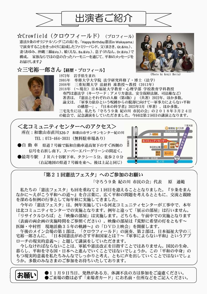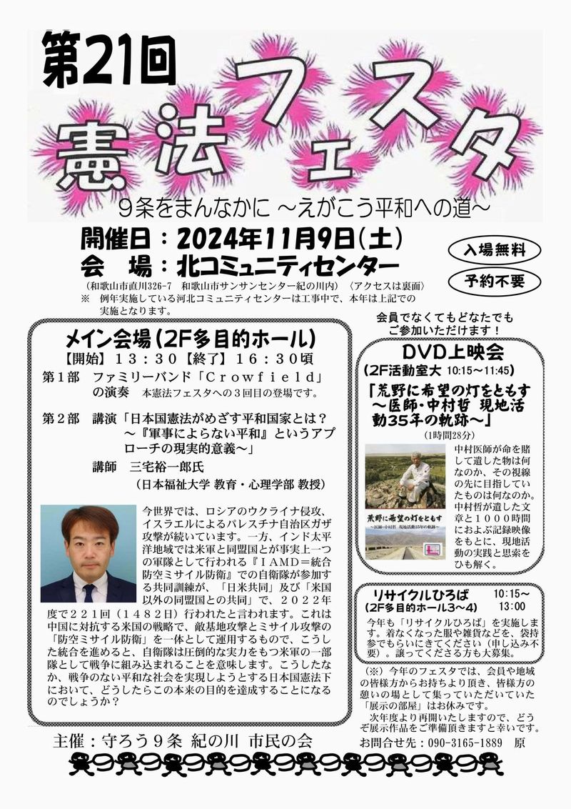 主催:守ろう9条 紀の川 市民の会 お問合せ先:090-3165-1889 原