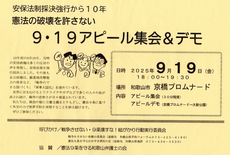 【チラシ】 ![]() 【文字情報】 安保法制採決強行から10年 憲法の破壊を許さない 9・19アピール集会&デモ 10年前の9月19日、当時の安倍政権は多くの反対の声を無視し、安保法案を強行採決しました。その後も自公政権は、敵基地攻擊能力の保有など、「戦争のできる国づくり」「軍事大国化」を進めています。 世界に目をむけるとウクライナやガザなどで多くの人々の血が流され続け、戦争の悲惨さが日々報道されています。 私たちは、政治の場に立憲主義をとりもどし、憲法9条に基づく外交の力で世界平和を実現することを訴え続けます。 ぜひご参加ください。 日時 2025年9月19日(金) 18:00~19:30 場所 和歌山市 京橋プロムナード 内容 アピール集会(30分程度) アピールデモ(京橋プロムナード→大新公園) 呼びかけ/戦争させない・9条壊すな! 総がかり行動実行委員会 戦争をさせない和歌山委員会(連絡先 和歌山県平和フォーラム073-425-4180) 憲法九条を守るわかやま県民の会(連絡先 和歌山県地評 073-436-3520) 協賛/憲法9条を守る和歌山弁護士の会 |