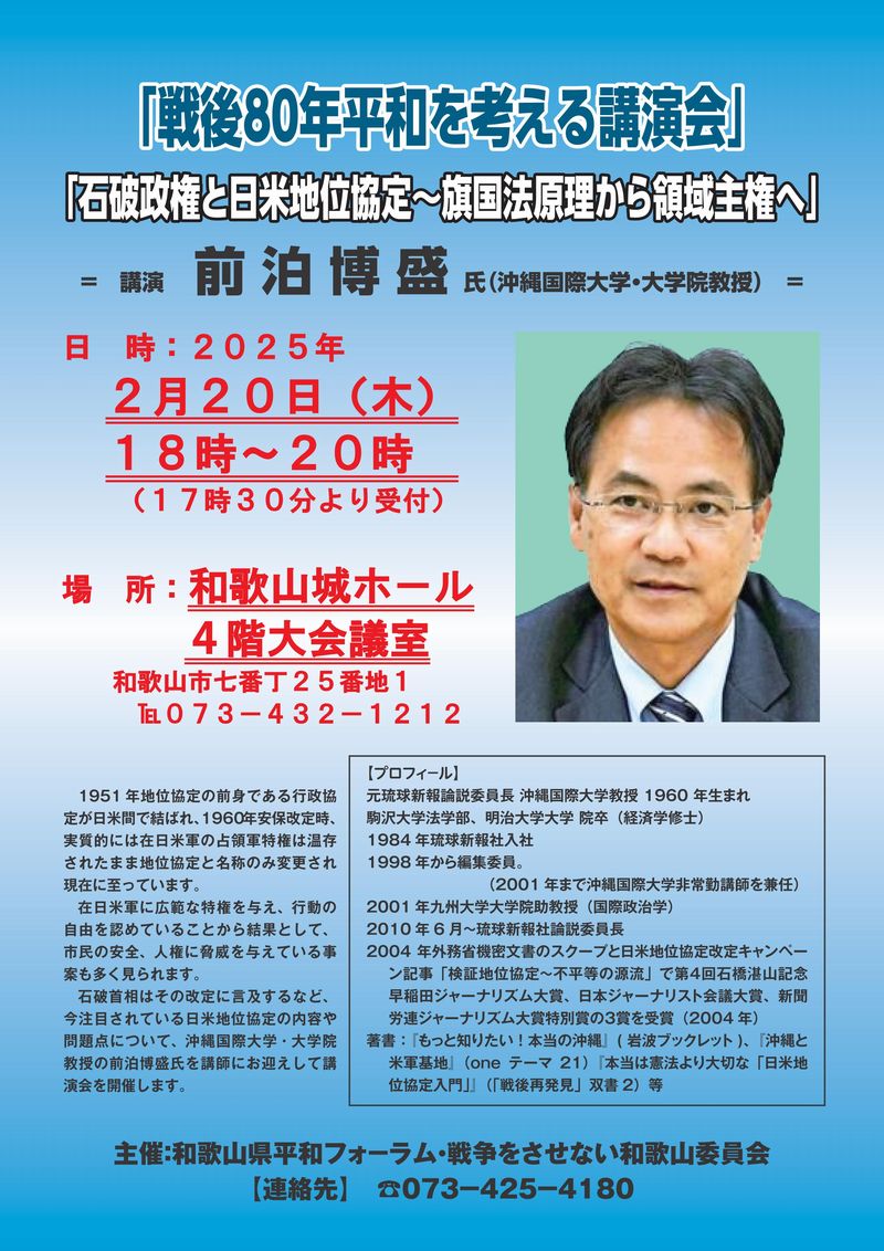 【チラシ】 ![]() 【文字情報】 戦後80年平和を考える講演会 「石破政権と日米地位協定~旗国法原理から領域主権へ」 = 講演 前泊博盛氏(沖縄国際大学・大学院教授) = 日時:2025年2月20日(木)18時~20時(17時30分より受付) 場所:和歌山城ホール4階大会議室 和歌山市七番丁25番地1 TEL 073-432-1212 1951年地位協定の前身である行政協定が日米間で結ばれ、1960年安保改定時、実質的には在日米軍の占領軍特権は温存されたまま地位協定と名称のみ変更され現在に至っています。 在日米軍に広範な特権を与え、行動の自由を認めていることから結果として、 市民の安全、人権に脅威を与えている事案も多く見られます。 石破首相はその改定に言及するなど、今注目されている日米地位協定の内容や問題点について、沖縄国際大学・大学院教授の前泊博盛氏を講師にお迎えして講演会を開催します。 【プロフィール】 元琉球新報論説委員長 沖縄国際大学教授 1960年生まれ 駒沢大学法学部、明治大学大学院卒(経済学修士) 1984年琉球新報社入社 1998年から編集委員 (2001年まで沖縄国際大学非常勤講師を兼任) 2001年九州大学大学院助教授(国際政治学) 2010年6月~琉球新報社論説委員長 2004年 外務省機密文書のスクープと日米地位協定改定キャンペーン記事「検証地位協定~不平等の源流」で第4回石橋湛山記念早稲田ジャーナリズム大賞、日本ジャーナリスト会議大賞、新聞労連ジャーナリズム大賞特別賞の3賞を受賞 (2004年) 著書: 『もっと知りたい! 本当の沖縄』 (岩波ブックレット)、「沖縄と 米軍基地」(one テーマ 21) 「本当は憲法より大切な「日米地 位協定入門」』(「戦後再発見」双書2)等 主催:和歌山県平和フォーラム・戦争をさせない和歌山委員会 【連絡先】 073-425-4180 |
