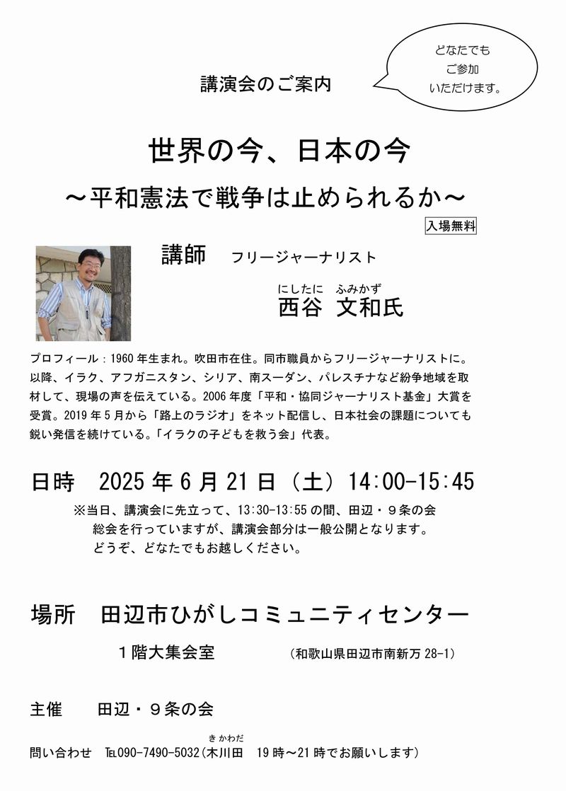 ※当日、講演会に先立って、13:30-13:55の間、田辺・9条の会総会を行っていますが、講演会部分は一般公開となります。 どうぞ、どなたでもお越しください。