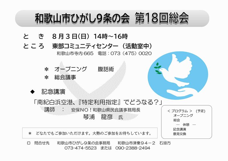 【チラシ】 ![]() 【文字情報】 和歌山市ひがし9条の会 第18回総会 とき 8月3日(日) 14時~16時 ところ 東部コミュニティセンター (活動室中) 和歌山市寺内665 電話:073(475)0020 ✽ オープニング 腹話術 ✽ 総会議事 ◆ 記念講演 「南紀白浜空港、『特定利用指定』でどうなる?」 講師 : 安保NO!和歌山県民会議事務局長 琴浦 龍彦 氏 どなたでもご参加いただけます。大勢のご参加をお待ちしています。 問合せ先 和歌山市ひがし9条の会事務局 和歌山市津秦94-2 石垣方 073-474-5523 または 090-2388-2494 |