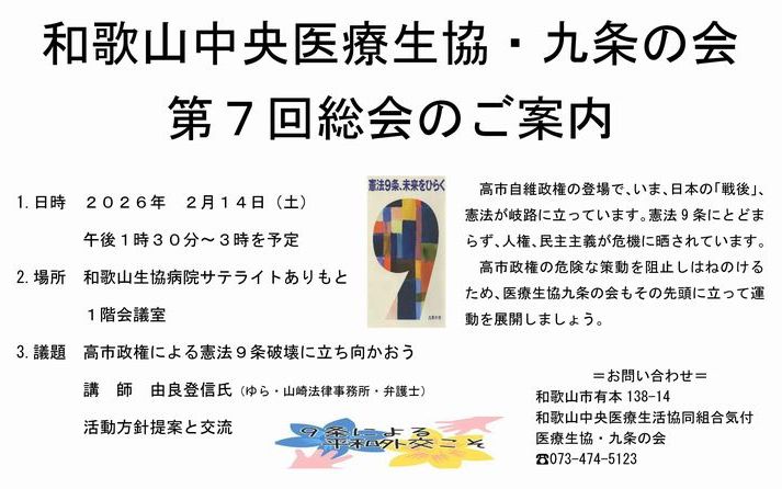 【チラシ】 ![]() 【文字情報】 和歌山中央医療生協・九条の会 第7回総会のご案内 1.日時 2026年 2月14日(土) 午後1時30分~3時を予定 2.場所 和歌山生協病院サテライトありもと 1階会議室 3.議題 高市政権による憲法9条破壊に立ち向かおう 講 師 由良登信氏(ゆら・山崎法律事務所・弁護士) 活動方針提案と交流 高市自維政権の登場で、いま、日本の「戦後」、憲法が岐路に立っています。憲法9条にとどまらず、人権、民主主義が危機に晒されています。 高市政権の危険な策動を阻止しはねのけるため、医療生協九条の会もその先頭に立って運動を展開しましょう。 =お問い合わせ= 和歌山市有本138-14 和歌山中央医療生活協同組合気付 医療生協・九条の会 Tel 073-474-5123 |