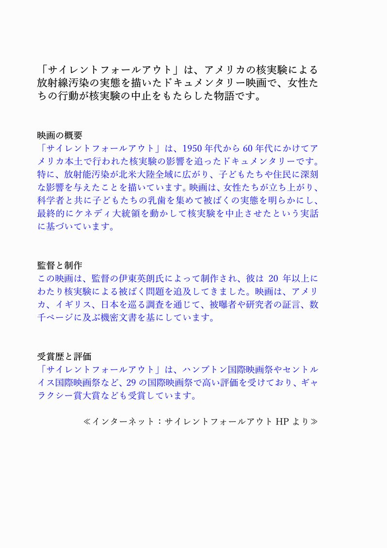 「サイレントフォールアウト」は、1950年代から60年代にかけてアメリカ本土で行われた核実験の影響を追ったドキュメンタリーです。特に、放射能汚染が北米大陸全域に広がり、子どもたちや住民に深刻な影響を与えたことを描いています。映画は、女性たちが立ち上がり、科学者と共に子どもたちの乳歯を集めて被ばくの実態を明らかにし、最終的にケネディ大統領を動かして核実験を中止させたという実話に基づいています。