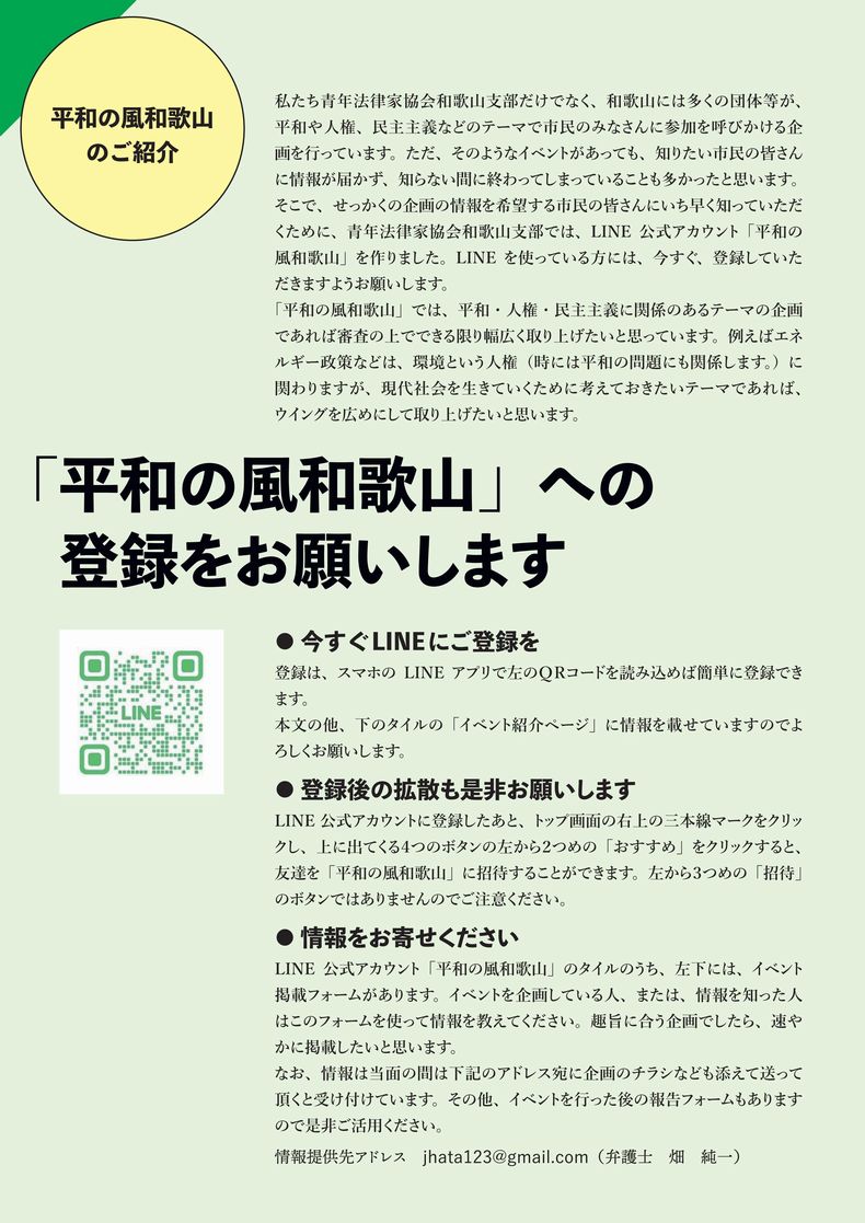 私たち青年法律家協会和歌山支部だけでなく、和歌山には多くの団体等が、平和や人権、民主主義などのテーマで市民のみなさんに参加を呼びかける企画を行っています。ただ、そのようなイベントがあっても、知りたい市民の皆さんに情報が届かず、知らない間に終わってしまっていることも多かったと思います。そこで、せっかくの企画の情報を希望する市民の皆さんにいち早く知っていただくために、青年法律家協会和歌山支部では、LINE公式アカウント「平和の風和歌山」を作りました。LINEを使っている方には、今すぐ、登録していただきますようお願いします。